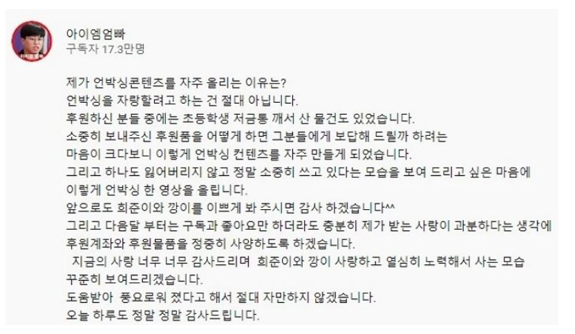 혼자 두 아이를 키우고 있는 아이엠엄빠에게 많은 사람들이 자발적 후원을 해 주었습니다. 후원계좌를 통해 후원금 뿐만 아니라 쌀과 물, 아이들 장난감, 로션등 많은 시청자가 지원을 아끼지 않았습니다. 이에따라 해당 유튜버도 언박싱하는 영상을 올렸는데요. 다음 달 부터는 후원을 받지 않겠다고 선언 했습니다. 이미 구독과 좋아요만 하더라도 과분한 사랑을 받고 있기 때문이라고 전했습니다.