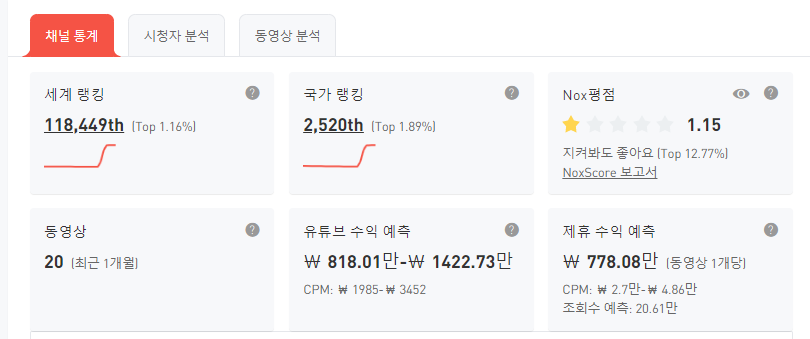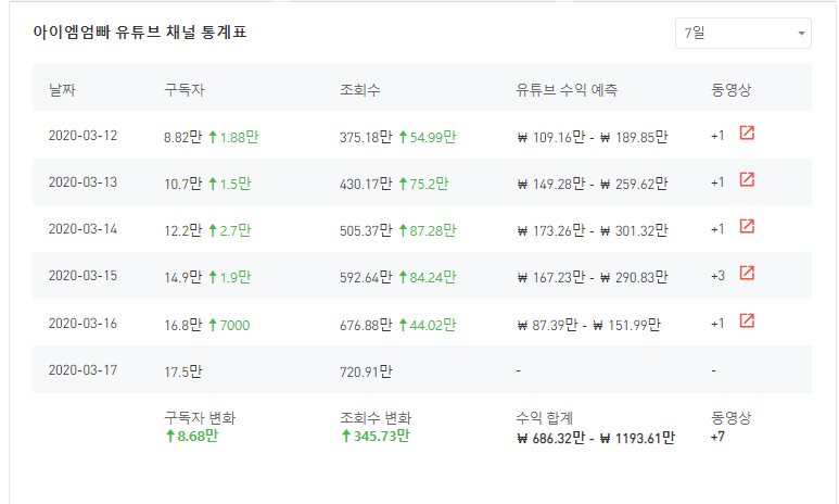 현재 아이엠엄빠 채널의 구독자순는 매우 가파르게 증가 하고 있습니다. 유튜버 인플루언서 사이트에서 급상승 채널 1순위를 기록하고 있는데요. 그러면 해당 채널의 수익은 얼마나 되는지 알아보겠습니다. 광고 수익으로 약 천만원 정도의 수익이 나고 있다고 예측 되네요. 동영상이 20개 정도 되는데 이 정도 수익이라니 놀랍네요.